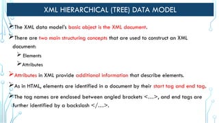The document explains the XML hierarchical data model, emphasizing that XML documents consist of elements and attributes structured in a tree format. It discusses the XML schema, which defines the structure and rules for XML documents, including simple and complex elements as well as built-in data types. Examples of XML and its corresponding schema are provided to illustrate how these components work together.