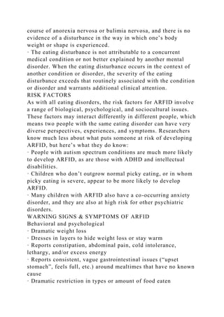 Avoidant/Restrictive Food Intake Disorder (ARFID) is a feeding disorder characterized by avoidance of food due to sensory characteristics, fear of aversive consequences, or lack of interest in eating. This results in insufficient calorie or nutrient intake leading to issues like weight loss, nutritional deficiencies, or interference with functioning. Treatments that have shown promise for ARFID include family-based treatment involving parents supporting exposure to new foods, cognitive-behavioral therapy with elements like food exposure and relaxation training, and hospital-based refeeding programs, some of which utilize tube feeding for severe cases. However, more research is still needed, as existing studies on treating ARFID are limited and no single approach has been proven