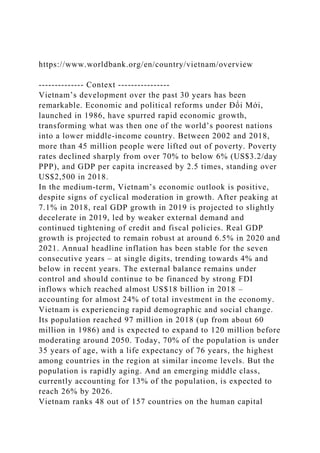 Vietnam has undergone significant economic and social transformation over the past 30 years, transitioning from one of the world’s poorest nations to a lower middle-income country. The World Bank's partnership has led to substantial investments and projects focused on sustainability, poverty reduction, and improving public health, ultimately benefiting millions and enhancing living standards. Despite these advances, challenges such as environmental degradation and the need for workforce skills adaptation remain critical for the country's ongoing development.