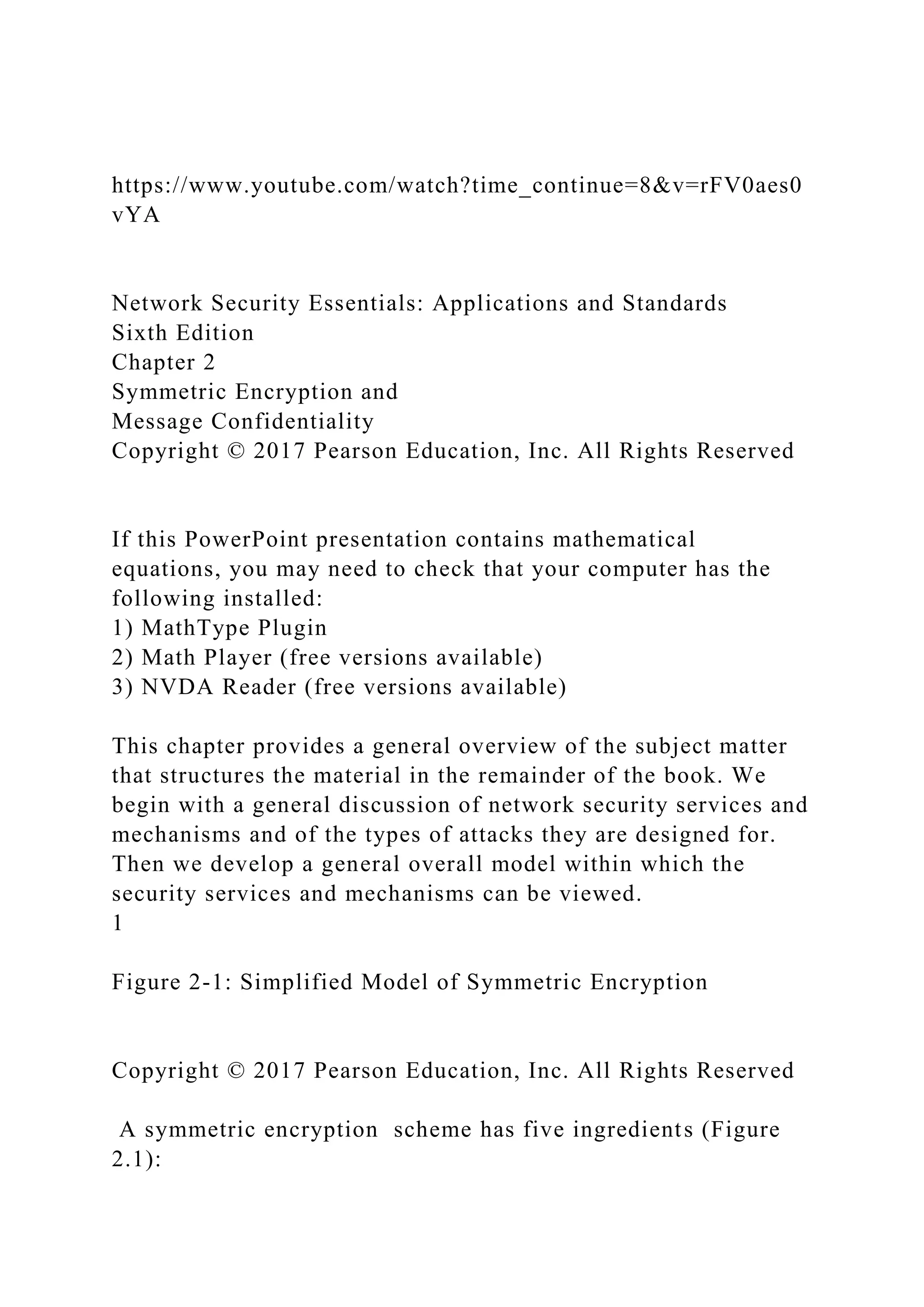 Chapter 2 of "Network Security Essentials: Applications and Standards" discusses symmetric encryption and its role in message confidentiality. It outlines the essential components of a symmetric encryption scheme, including plaintext, encryption algorithm, secret key, ciphertext, and decryption algorithm, emphasizing that the security depends on the secrecy of the key rather than the algorithm. The chapter also categorizes cryptographic systems and attacks, highlighting the significance of developing strong encryption algorithms and maintaining key security.