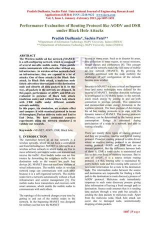 This document evaluates the performance of the AODV and DSR routing protocols under black hole attacks in a mobile ad hoc network (MANET). It conducts simulations using the network simulator NS-2 to compare the protocols' throughput, packet delivery ratio, and end-to-end delay both with and without black hole attacks from malicious nodes. The results show that under black hole attacks, the throughput and packet delivery ratio of both protocols decreases as the number of malicious nodes increases. However, AODV is shown to be more resistant to the effects of black hole attacks compared to DSR, experiencing smaller decreases in performance under black hole attacks.