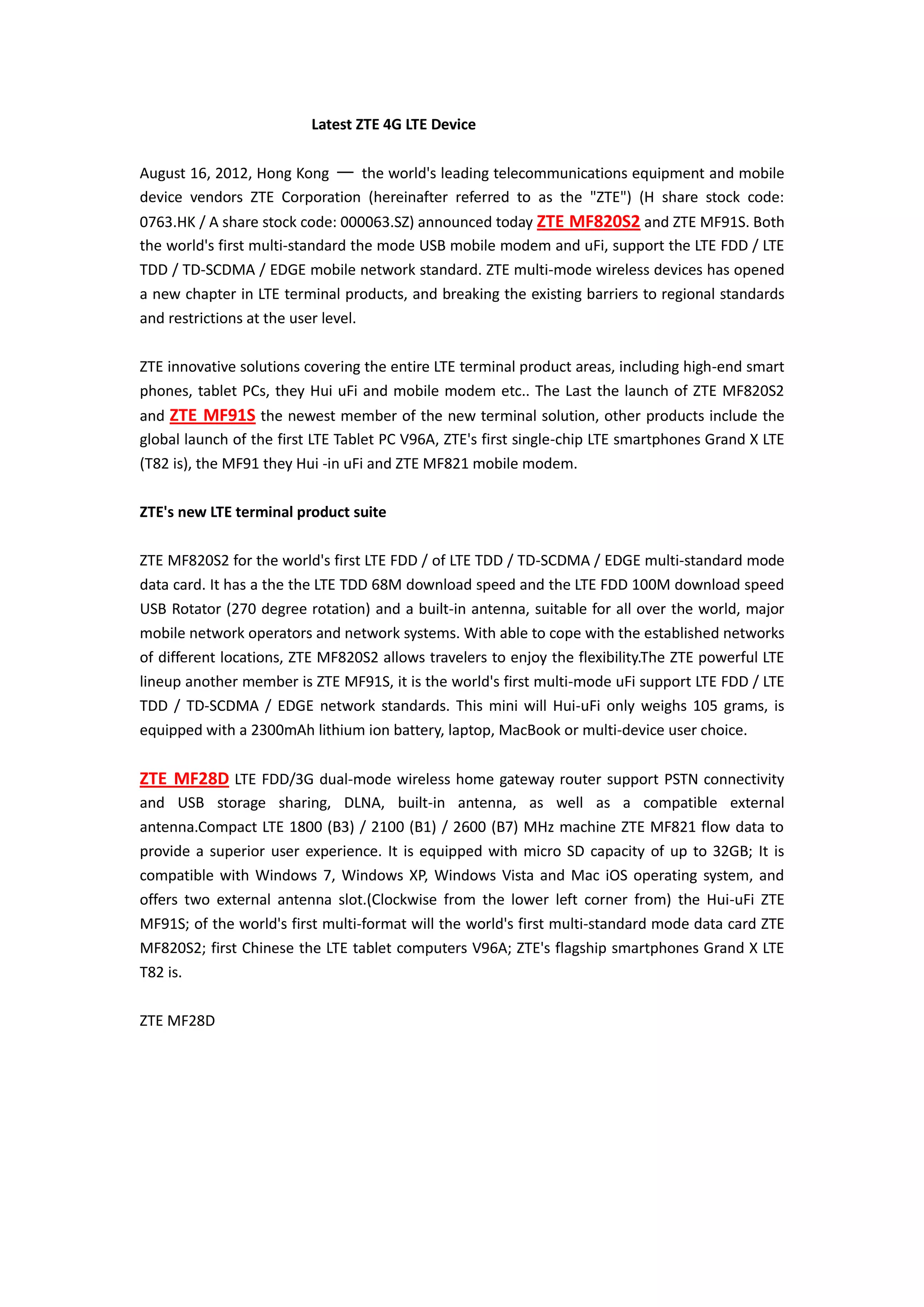The document summarizes several new LTE devices launched by ZTE, including the ZTE MF820S2 and ZTE MF91S. These devices are the world's first to support multiple LTE standards as well as 2G and 3G networks. They allow users to access high-speed LTE networks across different regions. ZTE also launched other new LTE products like tablets, smartphones, mobile WiFi hotspots, and routers to provide complete LTE solutions.