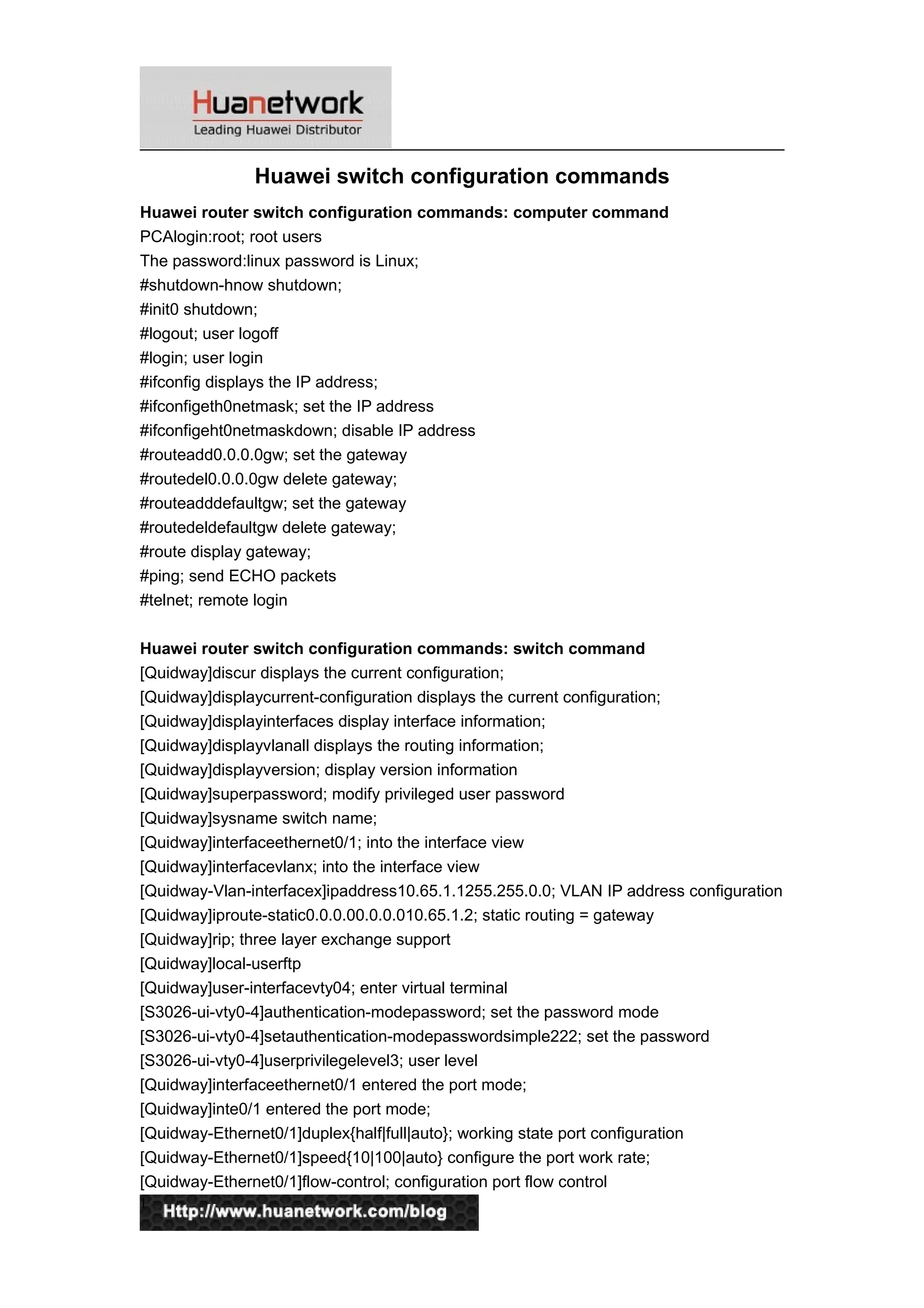 The document provides a comprehensive guide on Huawei router and switch configuration commands, detailing various commands for managing IP addresses, routing, VLANs, and user privileges. It covers both static and dynamic routing commands, access control list configurations, and NAT settings, enabling users to effectively set up and manage their networking equipment. Additional information and resources for Huawei networking products are also mentioned, including contact details for inquiries.