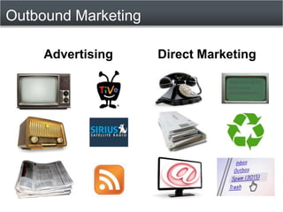 This document summarizes the HubSpot inbound marketing system. It provides tools to get found through SEO, social media, content creation and blogging. It helps convert visitors through lead intelligence, landing pages, and lead nurturing. Tools also analyze marketing campaigns, track ROI and provide closed-loop reporting. Getting started requires a $500 onboarding package for consulting and support is available for $250 per month. Studies show HubSpot users get 6x more leads and 61% lower costs per lead.