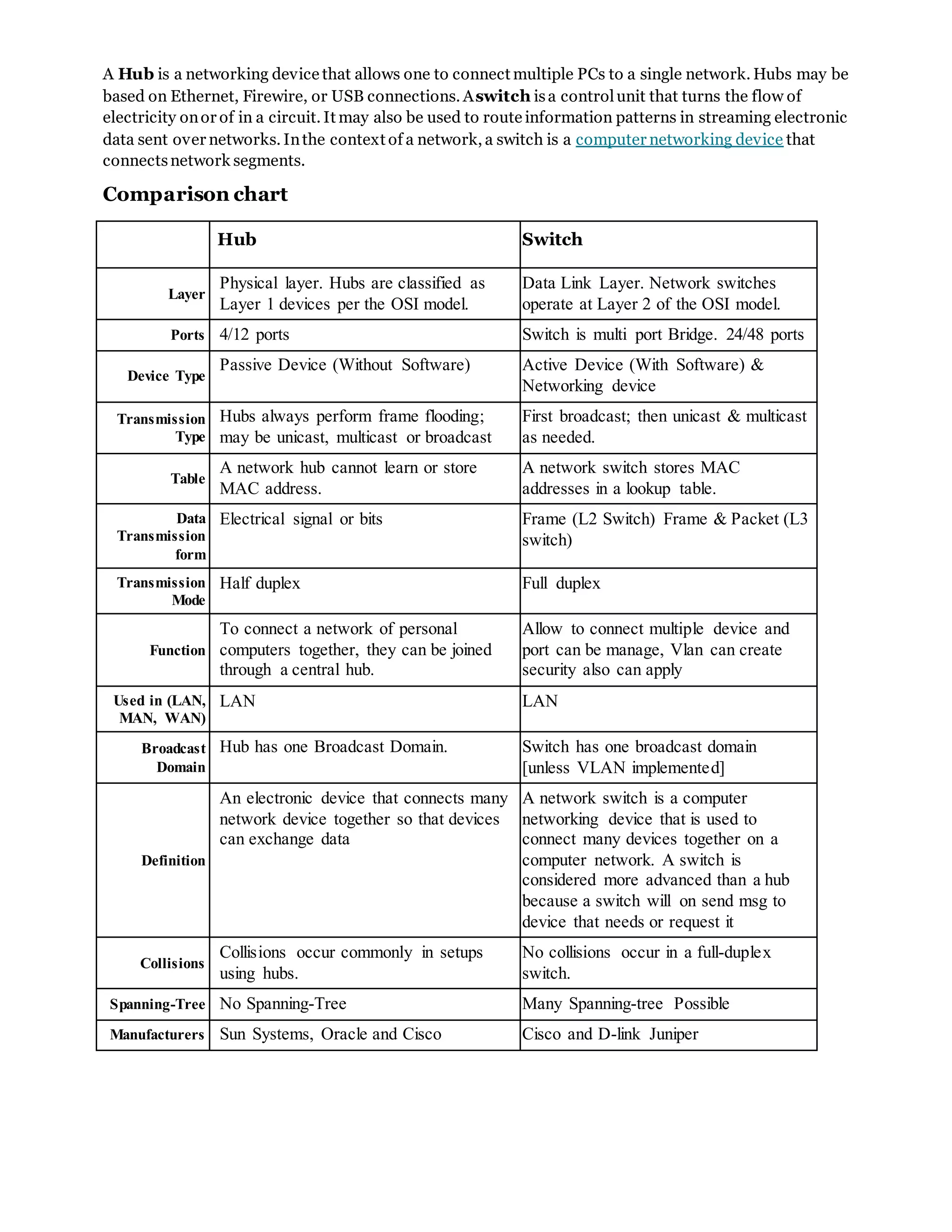 A hub is a networking device that connects multiple computers to a single network using Ethernet, Firewire, or USB connections. It operates at the physical layer of the OSI model and broadcasts all incoming data to all ports, which can cause collisions. A switch is a networking device that connects network segments and operates at the data link layer. It stores MAC addresses in a lookup table to route data only to necessary ports, preventing collisions. Switches allow full duplex communication and the implementation of features like VLANs, spanning trees, and more advanced routing capabilities compared to hubs.