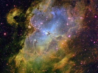 The Hubble Space Telescope is a robotic telescope located 593 km above Earth's surface. Named after Edwin Hubble, it was launched in 1990 as a joint NASA and ESA project. Hubble weighs 11 tons and can obtain images with a resolution of 0.1 seconds of arc. The document then provides 10 examples of Hubble's best photographs, which include galaxies, nebulae, and other celestial objects located between 2,500-114 million light years from Earth. It concludes by showing an image of the Eagle Nebula, where young stars are forming within gaseous emissions.