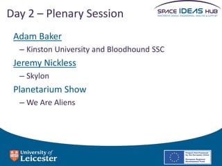 The document discusses boosting local enterprise in space technology. It summarizes presentations from Adam Baker on the Bloodhound SSC land speed record car project and its plans to develop small satellite launch vehicles. It also summarizes a presentation by Jeremy Nickless on the Skylon single-stage-to-orbit spaceplane and its SABRE engine, which can switch between air-breathing and rocket modes. Nickless discusses the development of Reaction Engines Ltd. and technologies like the pre-cooler that enable the SABRE engine. The document outlines the benefits of reusable launchers for commercial spaceflight and the future development plans for both projects.