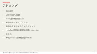 The document outlines the establishment and continuation of an internal HubSpot study group at Creative Hope, emphasizing its purpose of skill enhancement and knowledge sharing among employees. Key points include strategies for sustaining the group and the positive outcomes observed after 15 months, such as increased sales from HubSpot-utilized projects. The future vision includes expanding community engagement and possibly hosting public study sessions based on successful internal agendas.