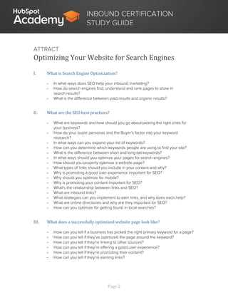 The document is an inbound certification study guide that covers essential concepts and practices from twelve certification classes on inbound marketing. It includes topics such as the inbound methodology, SEO best practices, content creation, blogging, social media strategies, and effective communication through emails and calls-to-action. Additionally, it emphasizes the importance of aligning marketing and sales strategies and delighting customers for successful inbound marketing.