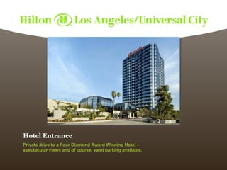 This Four Diamond hotel is located next to Universal Studios Hollywood and offers luxurious amenities. It has 473 guest rooms and suites with views of Universal Studios. Suites provide expansive accommodations similar to celebrity suites. The hotel has a lobby lounge, coffee shop, award-winning restaurant, executive boardroom, 16,000 square foot ballroom, and pool area with cabanas. It is situated in the entertainment district at the main entrance to Universal Studios, CityWalk, and the Gibson Amphitheater.