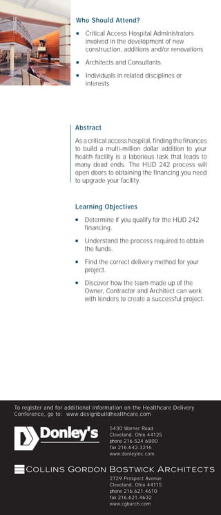 This document announces a roundtable presentation and discussion about financing a healthcare project using HUD 242 funding. The presentation will feature Bucyrus Community Hospital and their expansion project. Representatives from the hospital, a capital funding advisor, construction manager, and architect will discuss how they worked together using the HUD 242 process to obtain financing for the multi-million dollar addition. The abstract explains that the HUD 242 process can help critical access hospitals find financing to upgrade their facilities.