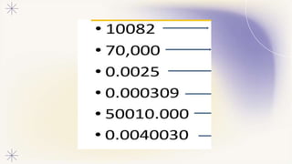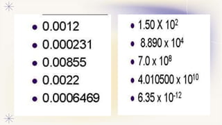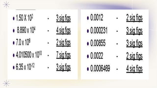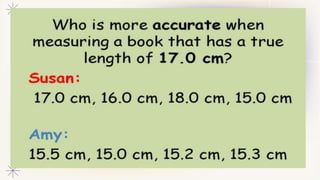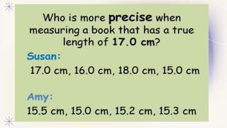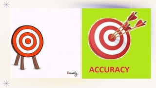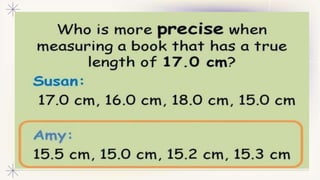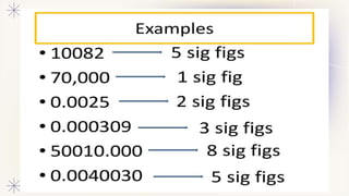 This document discusses accuracy, precision, and significant figures in measurement. It defines accuracy as how close a measurement is to the true value, and precision as how close repeated measurements are to each other. It then explains that significant figures refer to the useful digits in a measurement when written in scientific notation. The document outlines some key rules for determining the number of significant figures in a measurement, such as non-zero digits being significant but leading zeroes not, and zeroes between numbers or after a decimal being significant. It encourages practicing applying these rules to measurements.