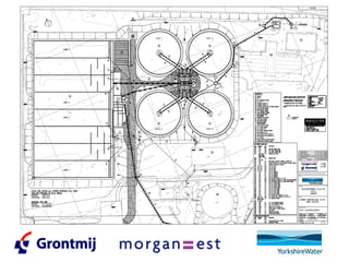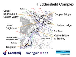 The document discusses the process commissioning of wastewater treatment works across multiple sites in Huddersfield. It outlines the scope of works including installing new activated sludge process lanes and tanks at Lower Brighersfield, new sludge treatment facilities at Calder Valley, and decommissioning biological filters and tanks at Cooper Bridge. It provides details on commissioning the new activated sludge process and sludge treatment works, and decommissioning the existing biological filters at Cooper Bridge over the period of July to October 2009.
