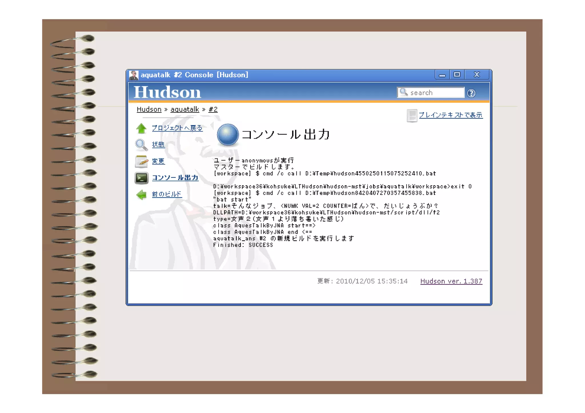 Jenkins(旧Hudson)公式サイト https://wiki.jenkins-ci.org/display/JA/Jenkins 使用Plugin setEnv Plugin BatchTask Plugin Go-kon plugin AquesTalk公式サイト http://www.a-quest.com/products/aquestalk.html 使ったライブラリ AquesTalk Win 拡張声種ライブラリ(Win用) 検証コードのURL https://github.com/kimukou26/hudsontest LTHudsonのフォルダ