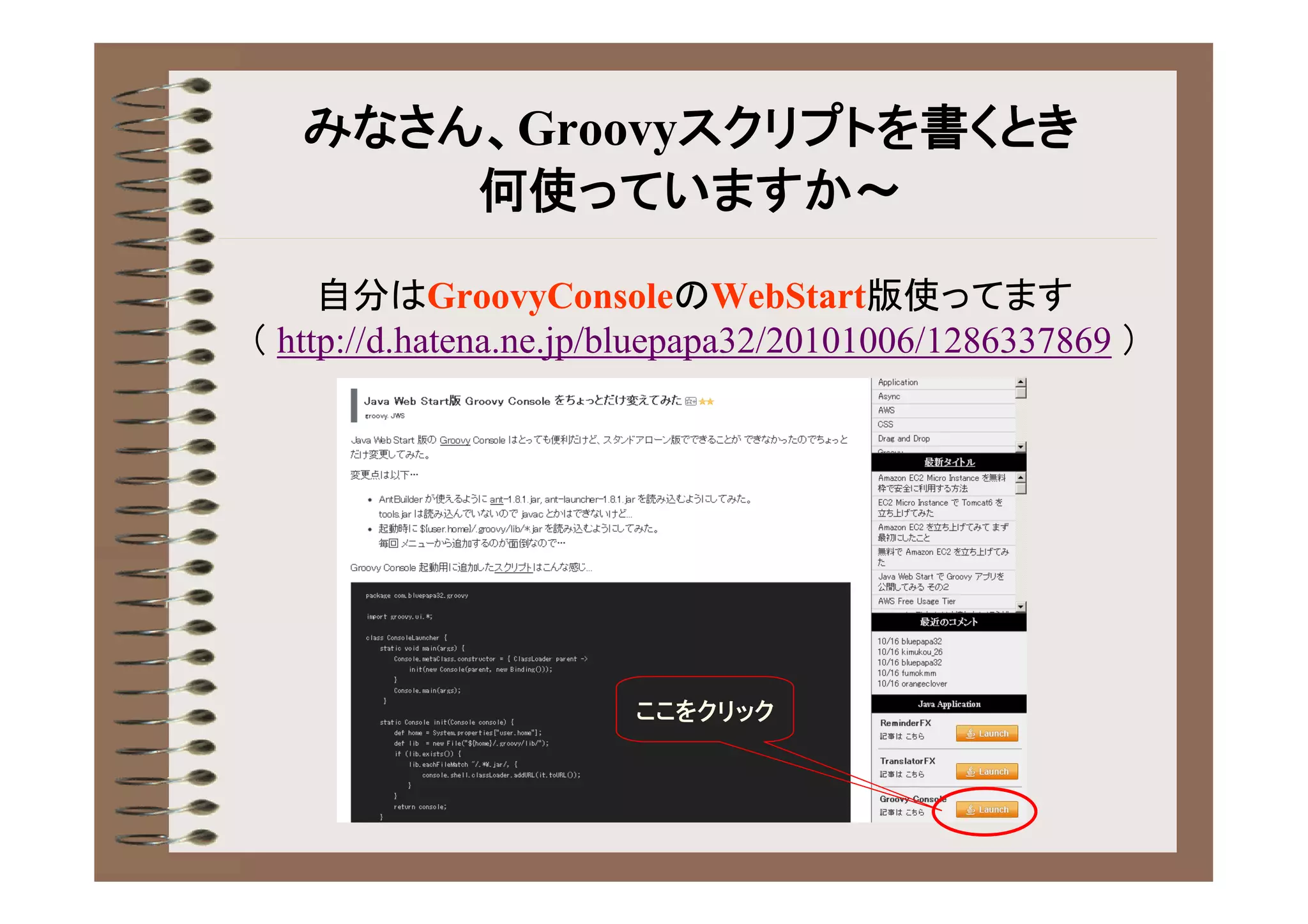 何使っていますか~ 自分はGroovyConsoleのWebStart版使ってます ( http://d.hatena.ne.jp/bluepapa32/20101006/1286337869 ) ここをクリック