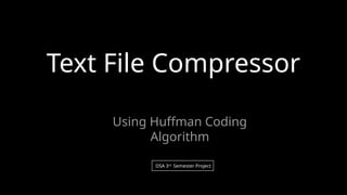 The document outlines a project on text file compression using the Huffman coding algorithm, which reduces redundancy in text files for efficient storage and transmission. It details the implementation process, including character frequency analysis, tree construction, and code generation, and highlights the data structures utilized. The project aims to demonstrate a lossless compression technique that effectively encodes characters based on their frequency, achieving significant reductions in overall file size.