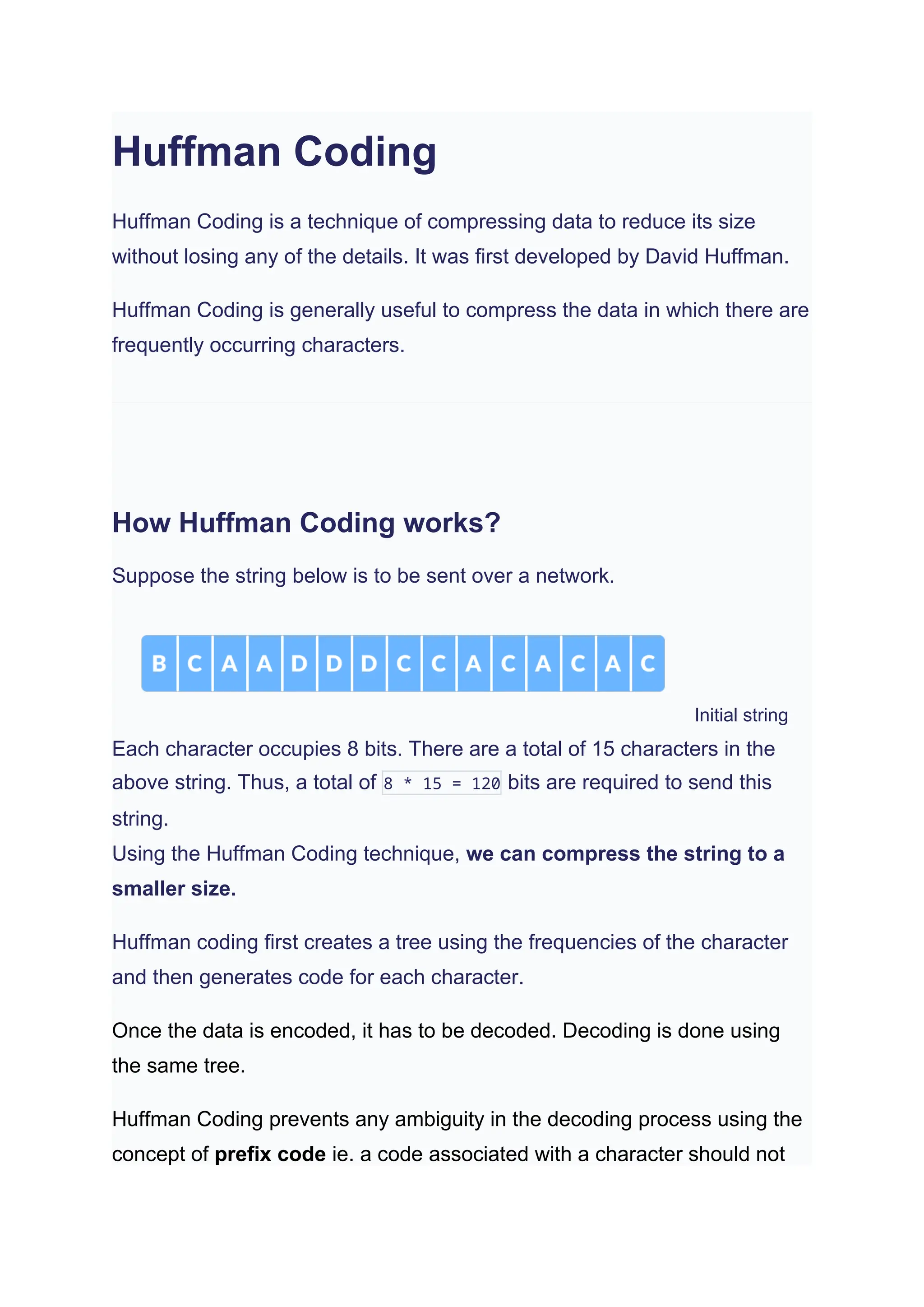 Huffman coding is a data compression technique that reduces file size without losing information, developed by David Huffman. It works by creating a binary tree based on the frequency of characters, allowing for efficient encoding and decoding of data. This method is widely used in compression formats such as gzip and is characterized by its time complexity of O(n log n).