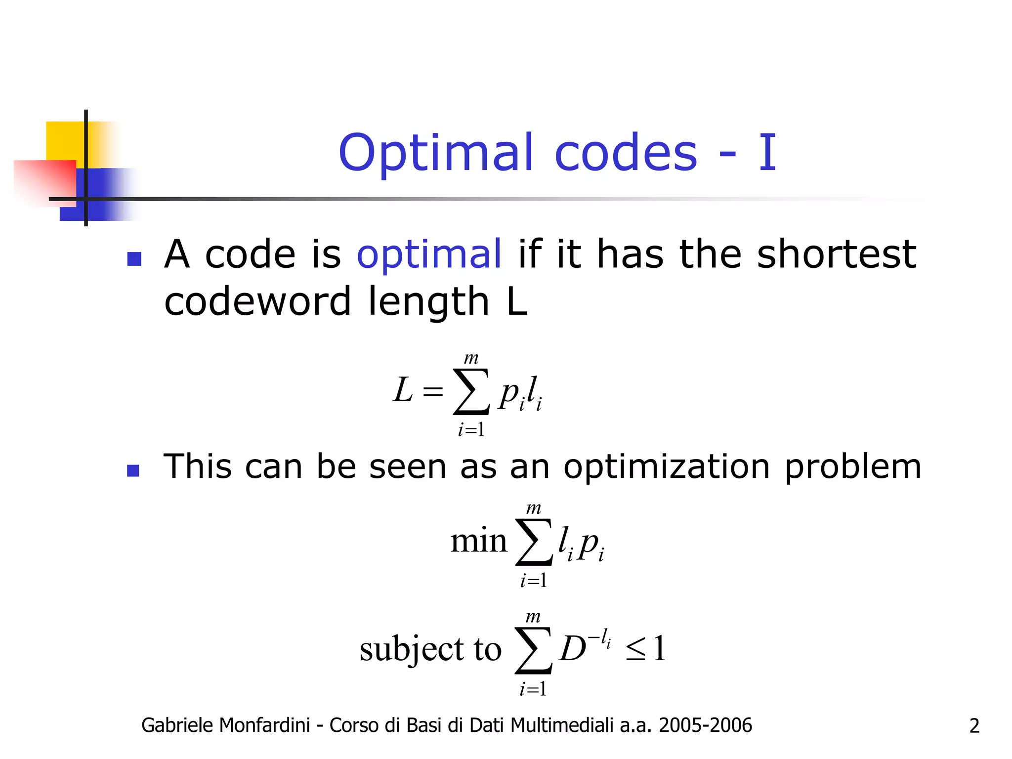 The document discusses Huffman coding and optimal codes. It explains that Huffman coding is an algorithm that constructs optimal prefix codes through a tree building process. The algorithm groups symbols by probability and assigns binary codewords based on the tree branches. This results in codewords with an average length that approaches the entropy limit, making Huffman codes optimal. The document provides examples of building Huffman trees and encoding/decoding data with the generated codes. It also discusses properties of optimal codes in general and notes that Huffman coding performs slightly better than Shannon-Fano coding.