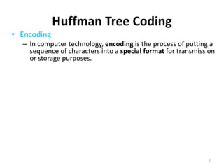 The document discusses Huffman tree coding, which is a variable-length encoding technique that assigns codewords of different lengths to symbols based on their frequency of occurrence. It explains how to create a Huffman tree from symbol frequencies, derive the Huffman codes, and use the codes to encode and decode messages. An example is provided where the frequencies of letters in an alphabet are used to generate a Huffman tree and codes, and a message is encoded and decoded to demonstrate the process.