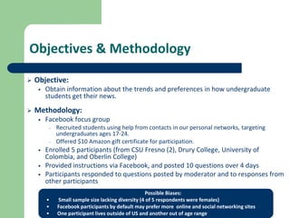 The document summarizes the findings of a qualitative research study that used a Facebook focus group to understand how undergraduate students get their news. The study found that students get news from a variety of sources and devices, preferring push notifications from social media and emails over searching directly. They value easily navigable sites with clear layouts, sharing features, and minimal ads. The document provides recommendations for The Huffington Post based on these findings, such as personalizing alerts and feeds, increasing social interactions, and focusing on the college demographic.