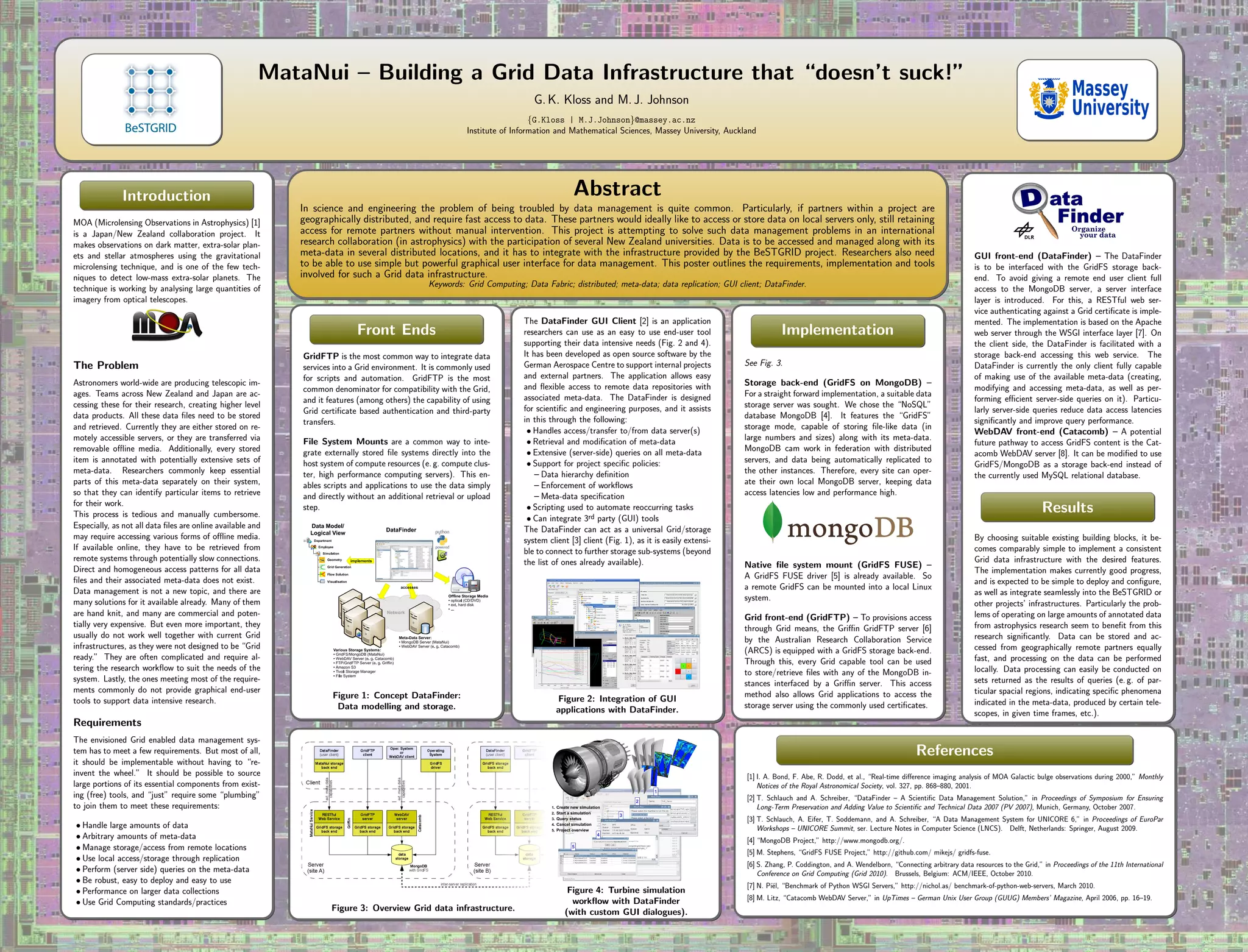 This document discusses the development of a grid data infrastructure called MataNui to manage large amounts of observational astronomical data and metadata from a collaboration between researchers in New Zealand and Japan. The infrastructure uses existing open-source tools like MongoDB, GridFTP, and the DataFinder GUI client to allow distributed storage and access of data while meeting requirements like handling large data volumes, metadata, and remote access. This approach provides a robust, reusable, and user-friendly system to address common data management challenges in scientific collaborations.