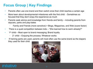 This document summarizes research conducted on Huggies Pull-Ups for a summer intern project. It provides background on Huggies and the disposable diaper industry, findings from focus groups and store observations. Key insights include parents seeking guidance on children's development and potty training. The strategy is to position Pull-Ups as essential for potty training milestones. The target audience is open-minded, family-focused women ages 25-44 with 1-5 year old children. Current and potential media tactics are also examined.