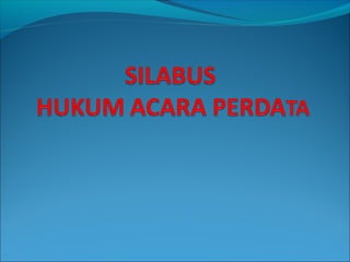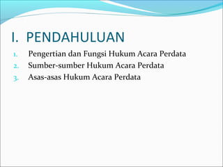 Dokumen tersebut membahas mengenai hukum acara perdata di Indonesia, mencakup pengertian dan sumber-sumber hukum acara perdata, asas-asas yang diterapkan dalam hukum acara perdata seperti asas sidang terbuka untuk umum dan asas mendengar kedua belah pihak, serta tata cara pengajuan tuntutan hak, proses pemeriksaan perkara di pengadilan, dan putusan hakim beserta pelaksanaannya.