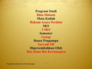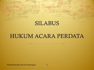 Dokumen ini membahas silabus mata kuliah hukum acara perdata yang mencakup pengertian, fungsi, sumber-sumber, dan asas hukum acara perdata serta proses pemeriksaan perkara di pengadilan di Indonesia. Ditekankan pentingnya kekuasaan kehakiman yang merdeka dan berbagai aspek tata cara pengajuan tuntutan hak, termasuk putusan hakim dan pelaksanaannya. Juga diuraikan mengenai hak-hak para pihak, biaya berperkara, dan prinsip-prinsip keadilan dalam hukum acara perdata.