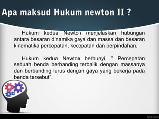 Hukum Newton II menjelaskan hubungan antara gaya, massa, dan percepatan, di mana percepatan berbanding lurus dengan gaya dan berbanding terbalik dengan massa. Contoh sehari-hari menunjukkan bahwa semakin kecil massa benda, semakin cepat benda tersebut bergerak saat diberikan gaya. Persamaan matematis Hukum Newton II dapat diterapkan untuk menghitung percepatan berdasarkan gaya yang diberikan dan massa benda.