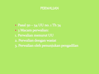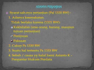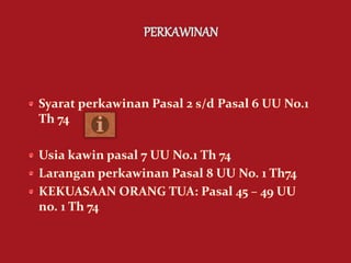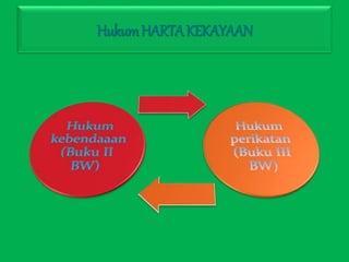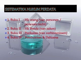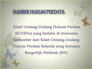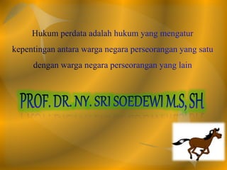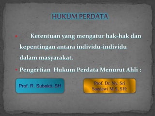 Hukum perdata mengatur hubungan hukum antar individu dalam 4 bidang utama: hukum perorangan, keluarga, harta warisan, dan perikatan. Mencakup topik seperti perkawinan, kekuasaan orang tua, harta benda, dan pengaturan kontrak antar pihak.