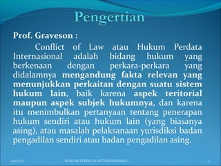 Hukum Perdata Internasional membahas perkara yang melibatkan lebih dari satu yurisdiksi hukum. Dokumen ini menjelaskan tentang pengertian Hukum Perdata Internasional, ruang lingkupnya, dan tahapan penyelesaian perkara tersebut meliputi penetapan yurisdiksi, hukum yang berlaku, hingga penyelesaian secara materiil berdasarkan hukum tersebut.