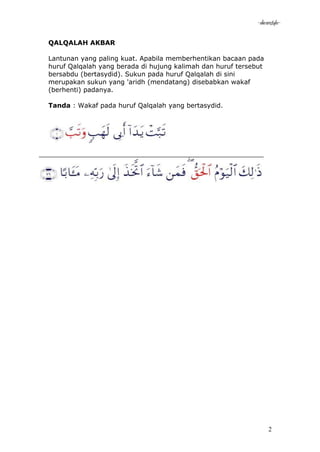 Dokumen ini membahas berbagai hukum tajwid yang berkaitan dengan huruf-huruf tertentu dalam bacaan Al-Qur'an. Terdapat penjelasan tentang qalqalah, iqlab, idgham, ikhfa', dan mad serta aturan bacaan yang tepat untuk masing-masing hukum. Pemahaman yang benar terhadap hukum tajwid sangat penting untuk mencapai keaslian dan keindahan dalam membaca Al-Qur'an.