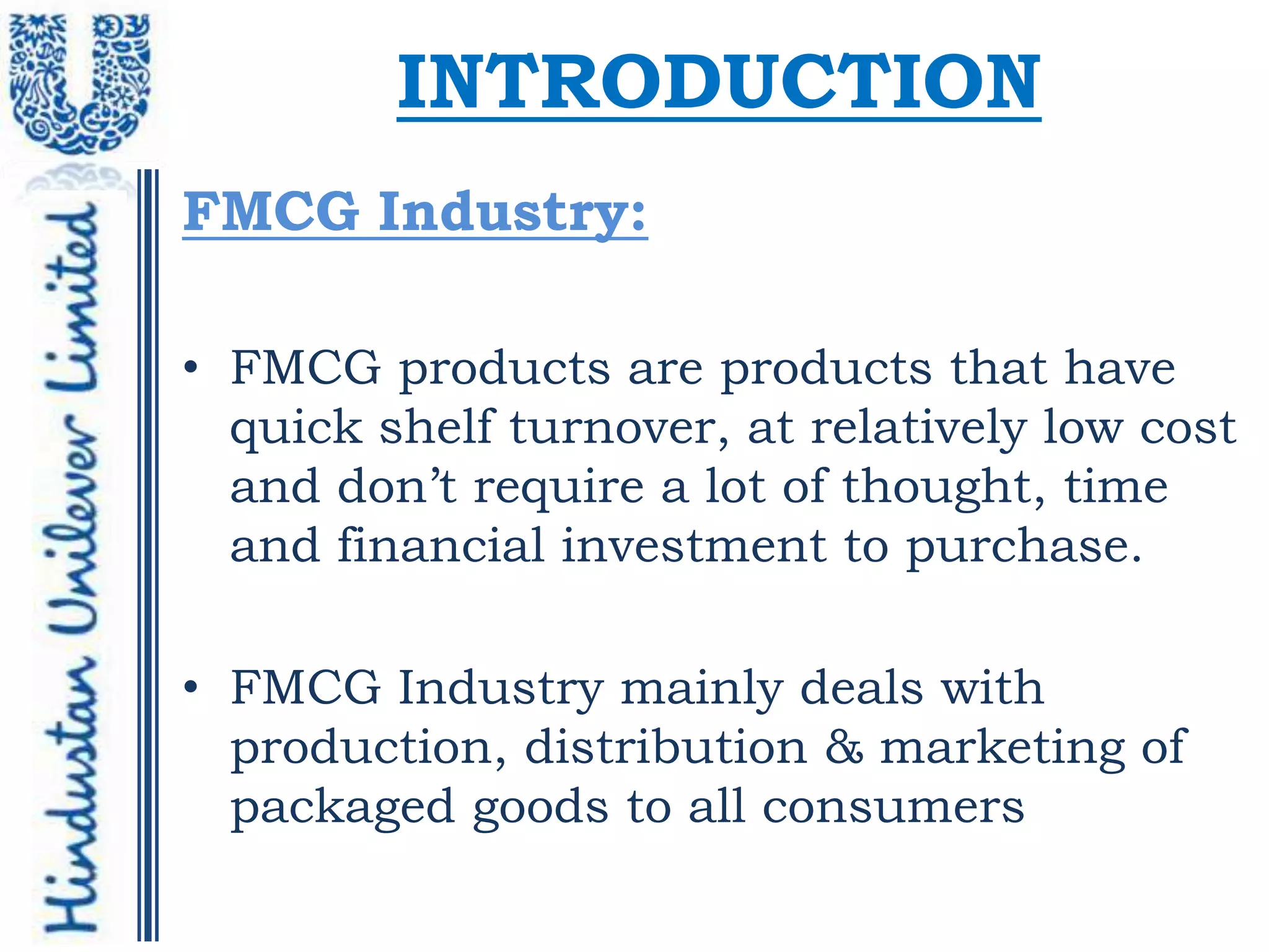 Hindustan Unilever Limited (HUL) is India's largest Fast Moving Consumer Goods (FMCG) company. It has a strong presence across India in both urban and rural areas. HUL faces competition from other domestic and multinational FMCG firms. However, it maintains an advantage through its large scale of operations, extensive distribution network, and portfolio of popular brands that serve a wide range of price points. The company continues to focus on innovation and adapting its products to evolving consumer demands in India.
