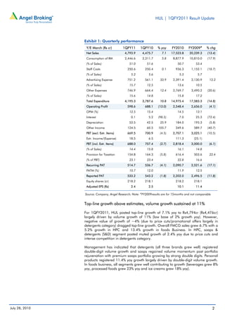 HUL reported disappointing 1QFY2011 results, with profits declining 4% due to a 34% rise in advertising spending. While revenue grew 7% driven by 11% volume growth, operating margins contracted significantly by 289 basis points. Higher competitive intensity in categories like detergents and soaps drove the increase in advertising. Weak profit growth and uncertain earnings outlook despite modest revenue growth lead us to maintain a reduce rating on the stock.