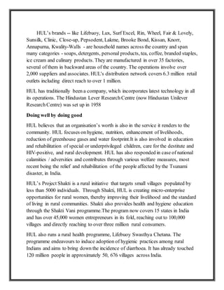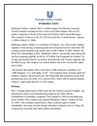 Hindustan Unilever Limited (HUL) is India's largest Fast Moving Consumer Goods company. It touches the lives of two out of three Indians with over 20 categories of home and personal care products and foods and beverages. HUL is a subsidiary of Unilever, one of the world's leading suppliers of fast moving consumer goods. HUL was formed in 1956 through the merger of three companies. It has over 15,000 employees and a turnover of Rs. 20,239 crores. HUL's mission is to "add vitality to life" through brands that help people feel good, look good and get more out of life.