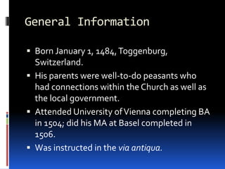 Huldrych Zwingli was a leading figure of the Protestant Reformation in Switzerland. He studied theology and became a priest, growing disillusioned with the Catholic Church. In 1519, he became a preacher in Zurich and began preaching reforms based solely on scripture. By 1523, Zurich had officially adopted Protestant theology. Zwingli believed in simplicity in worship, opposed Catholic doctrines like transubstantiation, and favored a state-run church. However, he disagreed with Luther on the real presence in communion. Zwingli was killed in battle in 1531 while fighting in defense of the Reformation in Switzerland.