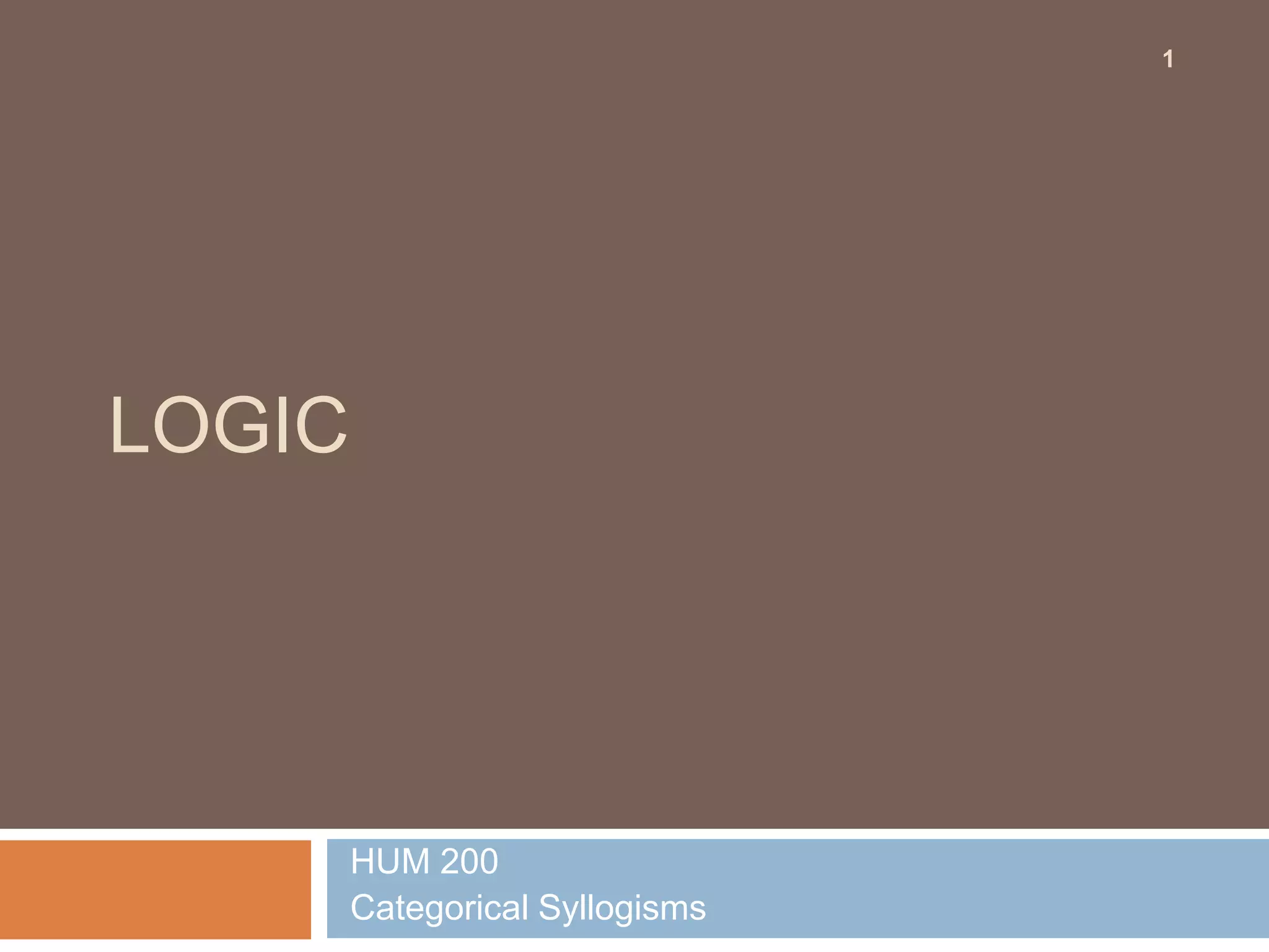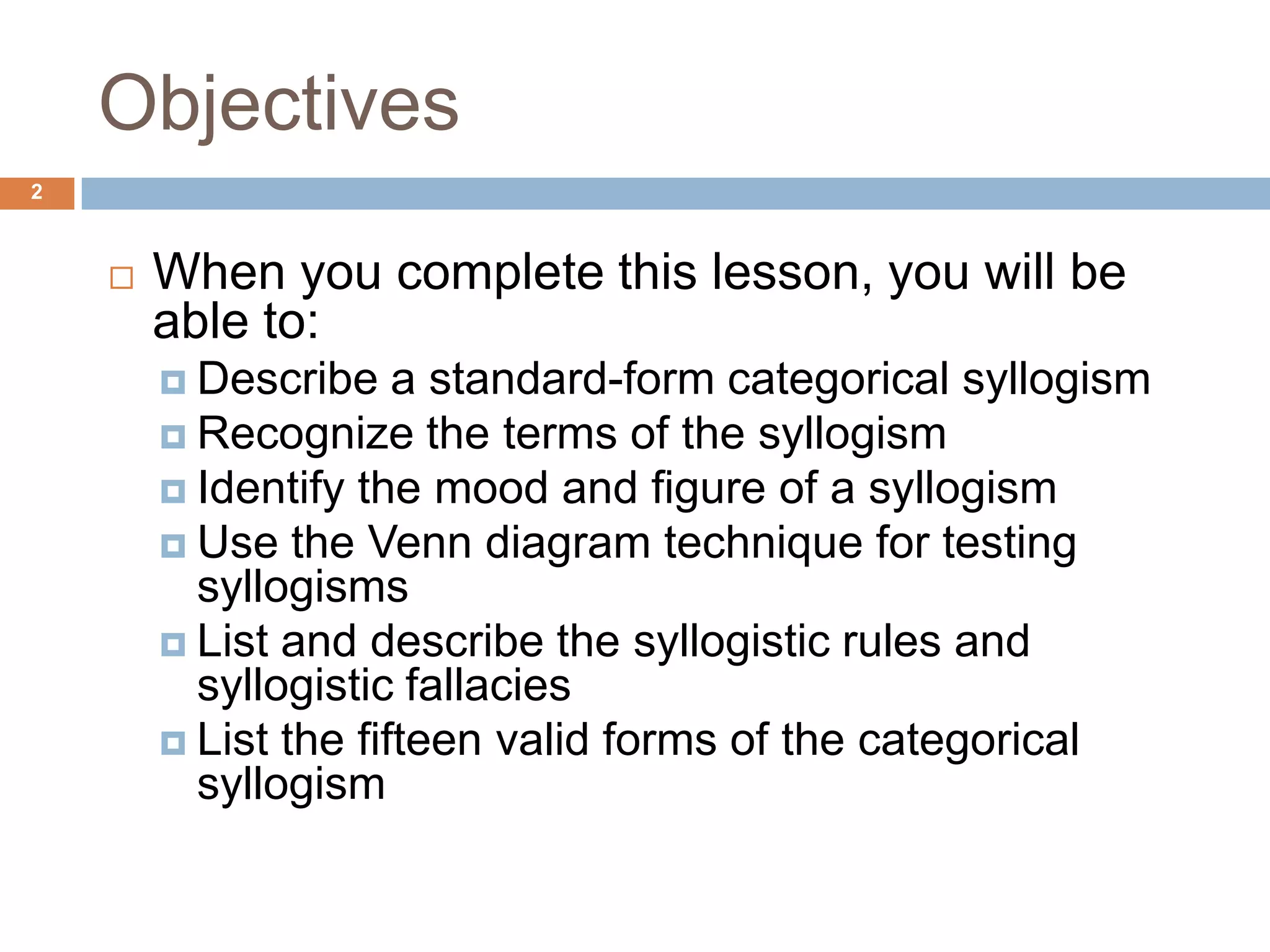 This document provides an overview of categorical syllogisms including their standard form, terms, mood and figure identification, validity testing using Venn diagrams, syllogistic rules and fallacies, and the 15 valid syllogistic forms. Key concepts covered are the three terms of the syllogism, using Venn diagrams to represent syllogisms and check their validity, and identifying the mood and figure of syllogisms. Examples are provided to demonstrate these syllogistic concepts.