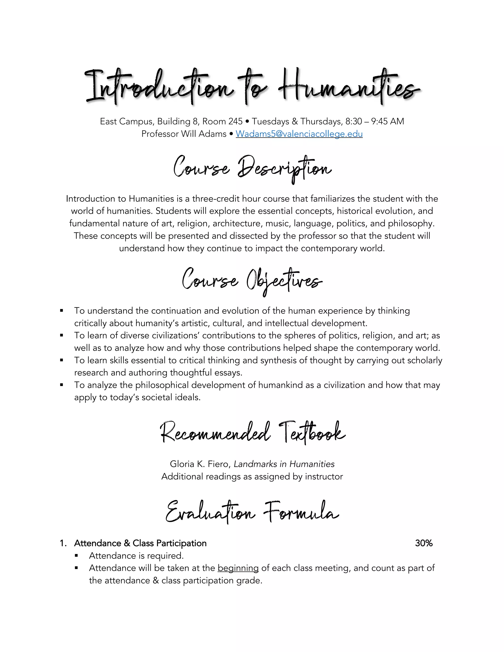 This 3-credit course introduces students to the essential concepts, historical evolution, and fundamental nature of the humanities, including art, religion, architecture, music, language, politics, and philosophy. Over the 15-week term, students will explore these topics through lectures, activities, assignments and exams. The course objectives are to understand humanity's artistic and intellectual development, analyze civilizations' contributions to various spheres, learn critical thinking skills, and analyze philosophy's application to today. Students will be evaluated based on attendance, participation, assignments, activities, quizzes, exams, and a recommended textbook.