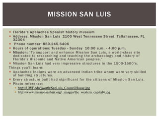 Mission San Luis is a history museum in Tallahassee, Florida that focuses on the Apalachee Indians and Spanish colonial history. The document discusses some of the impressive structures that were present at Mission San Luis during the 1500s-1600s, including the plaza, council house, and church. The plaza was located at the center of the compound and was used for trading, socializing, and playing games. The council house was the largest Indian structure in southern United States, holding up to 3,000 people for community and religious events. The church was the most important building and was used for religious services and ceremonies.