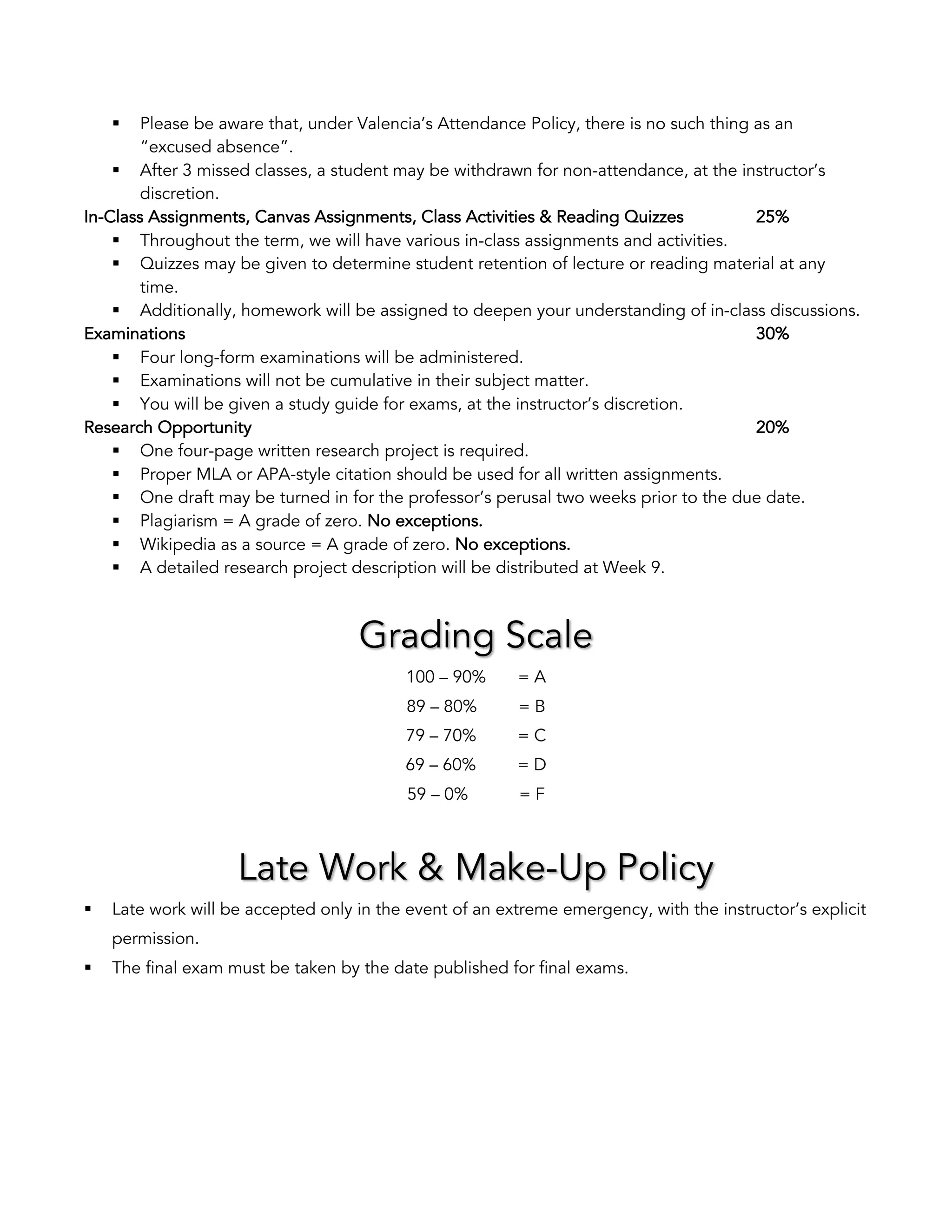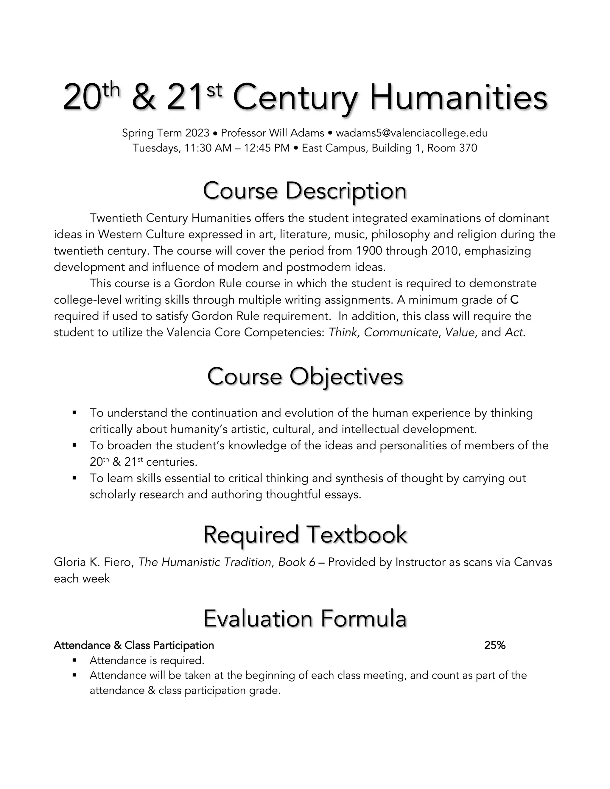 This document provides an overview of the 20th & 21st Century Humanities course for the Spring 2023 term. It outlines the course description, objectives, required textbook, evaluation criteria, schedule, and policies. The course will examine dominant Western ideas expressed in art, literature, music, philosophy and religion from 1900-2010. Students will complete exams, assignments, and a research project. Attendance, participation, and following academic honesty policies are required. The course aims to develop critical thinking about humanity's cultural and intellectual development over the past centuries.