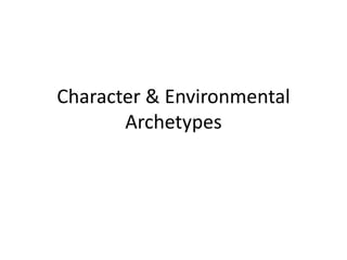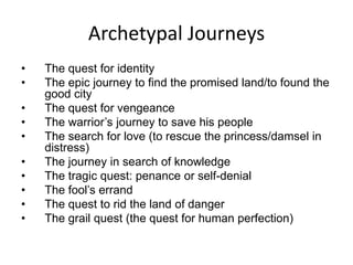 The document discusses archetypal journeys and characteristics of the hero's journey. Some common archetypal journeys include the quest for identity, the journey to find a promised land, quests for vengeance or to save one's people, searches for love or knowledge, and grail quests. Characteristics of the hero's journey are that the hero is inexperienced, meets monsters, has a mentor, yearns for a lady, must go on a journey and return changed, crosses bodies of water, has a mysterious origin, and struggles for something important with divine help. The document also outlines character archetypes like the hero, mentor, devil figure, platonic ideal, damsel in distress, temptress, and