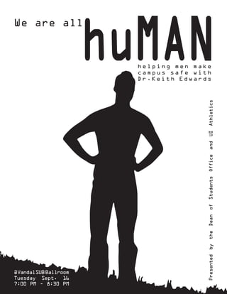 The document announces a presentation by Dr. Keith Edwards at the VandalSUB Ballroom on Tuesday September 16th from 7:00 PM to 8:30 PM. The presentation, presented by the Dean of Students Office and UI Athletics, is called "We are all huMAN helping men make campus safe."