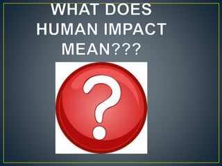 This document discusses various human impacts on the environment including population growth, deforestation, pollution, waste production, and resource depletion. It notes that industrialization and burning fossil fuels increases air and water pollution and greenhouse gas emissions. Deforestation reduces forests and biodiversity while pollution degrades air, water, and land quality. The depletion of natural resources also affects the environment if not managed sustainably. Climate change brought on by these factors threatens ecosystems and species survival.