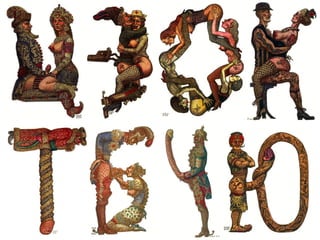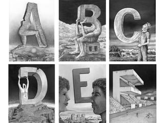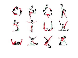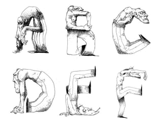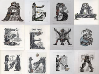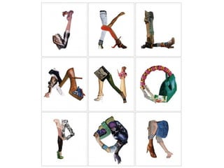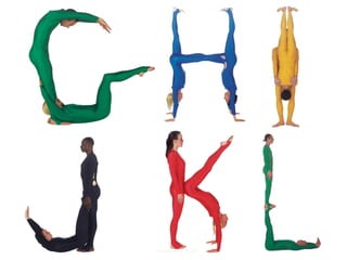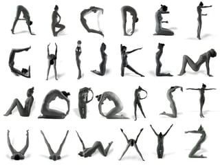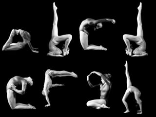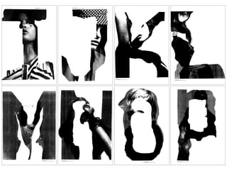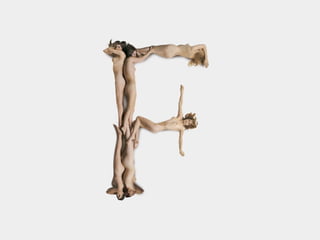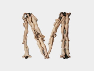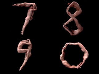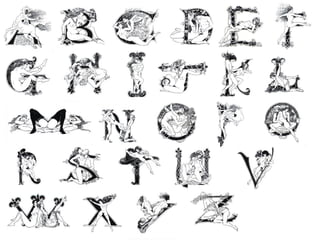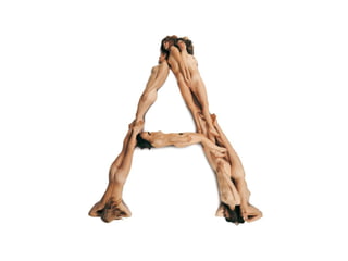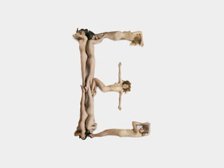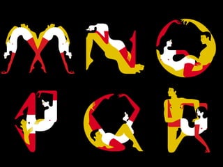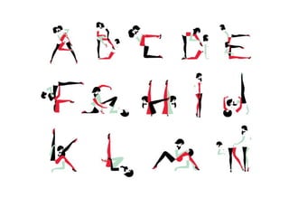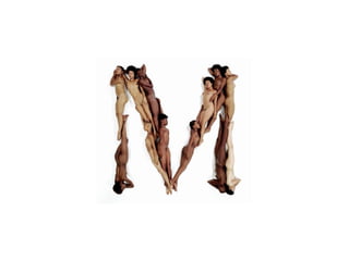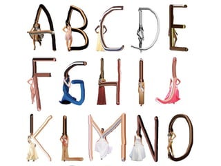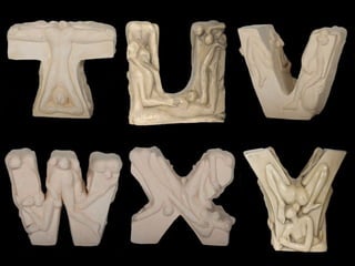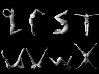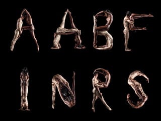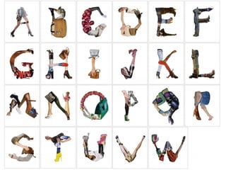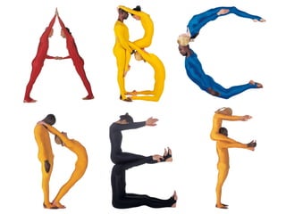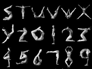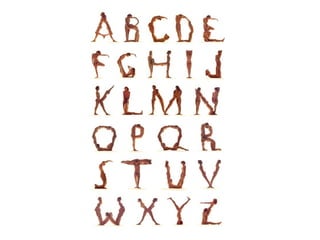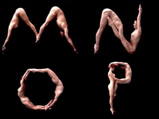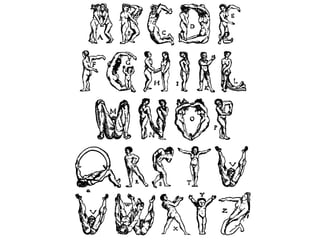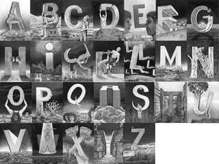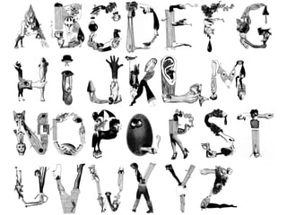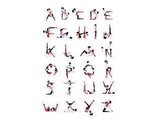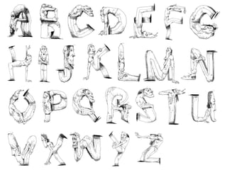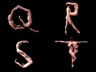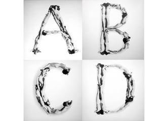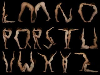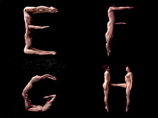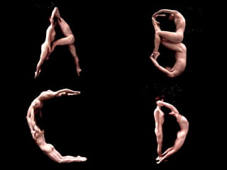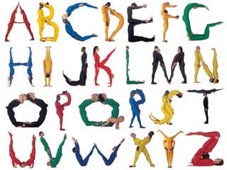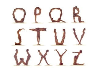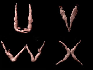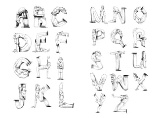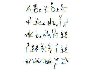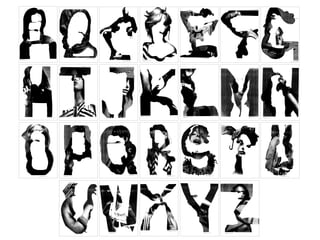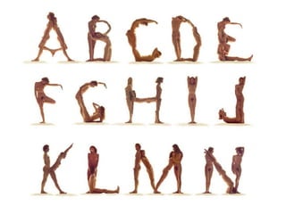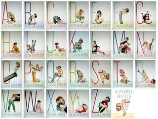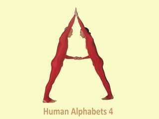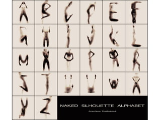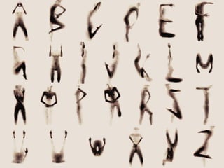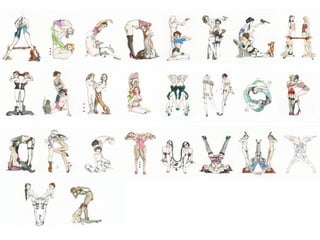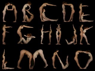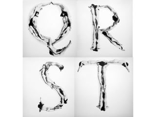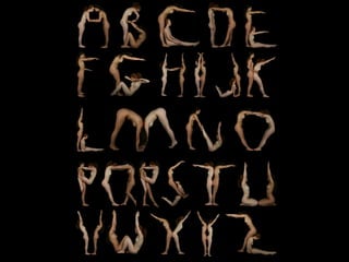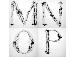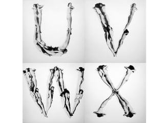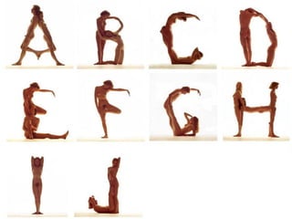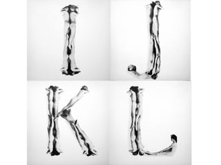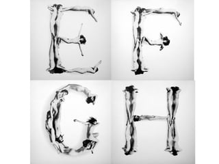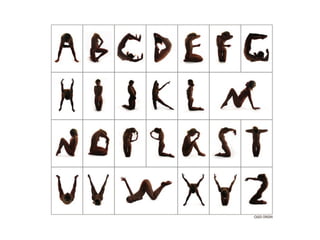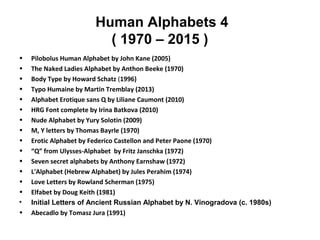 This document lists and provides details on 26 human alphabet artworks created between 1970 and 2015. Some of the works include the Pilobolus Human Alphabet by John Kane (2005), The Naked Ladies Alphabet by Anthon Beeke (1970), Body Type by Howard Schatz (1996), and Typo Humaine by Martin Tremblay (2013). The list includes the title, artist, date, brief description, and links for many of the alphabet artworks.