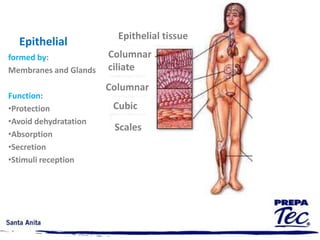 This document provides an overview of basic human anatomy concepts and classification. It begins by defining anatomy and physiology, with anatomy describing the parts of the organism and physiology explaining how those parts interact functionally. It then discusses the different levels of anatomical classification from cellular to organic to systemic. Several examples of anatomical divisions and views of the body are also presented, including sagittal, frontal, and transverse views. The four basic tissue types - epithelial, connective, muscular, and nervous - are introduced along with some examples. Key body cavities and a basic overview of the main internal organs are also summarized.