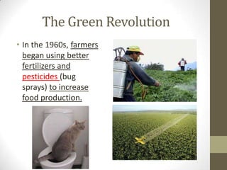 The Green Revolution in the 1960s led farmers to use fertilizers and pesticides to increase food production, resulting in more crops and higher populations but also dangerous chemicals in the environment and erosion. Increased populations caused greater urbanization and industrialization, with over 3.5 billion people living in cities by 2005, leading to localized pollution, disease spread, and wildlife habitat loss as natural areas were developed. This utilization of resources to support larger populations also results in more environmental pollution worldwide.