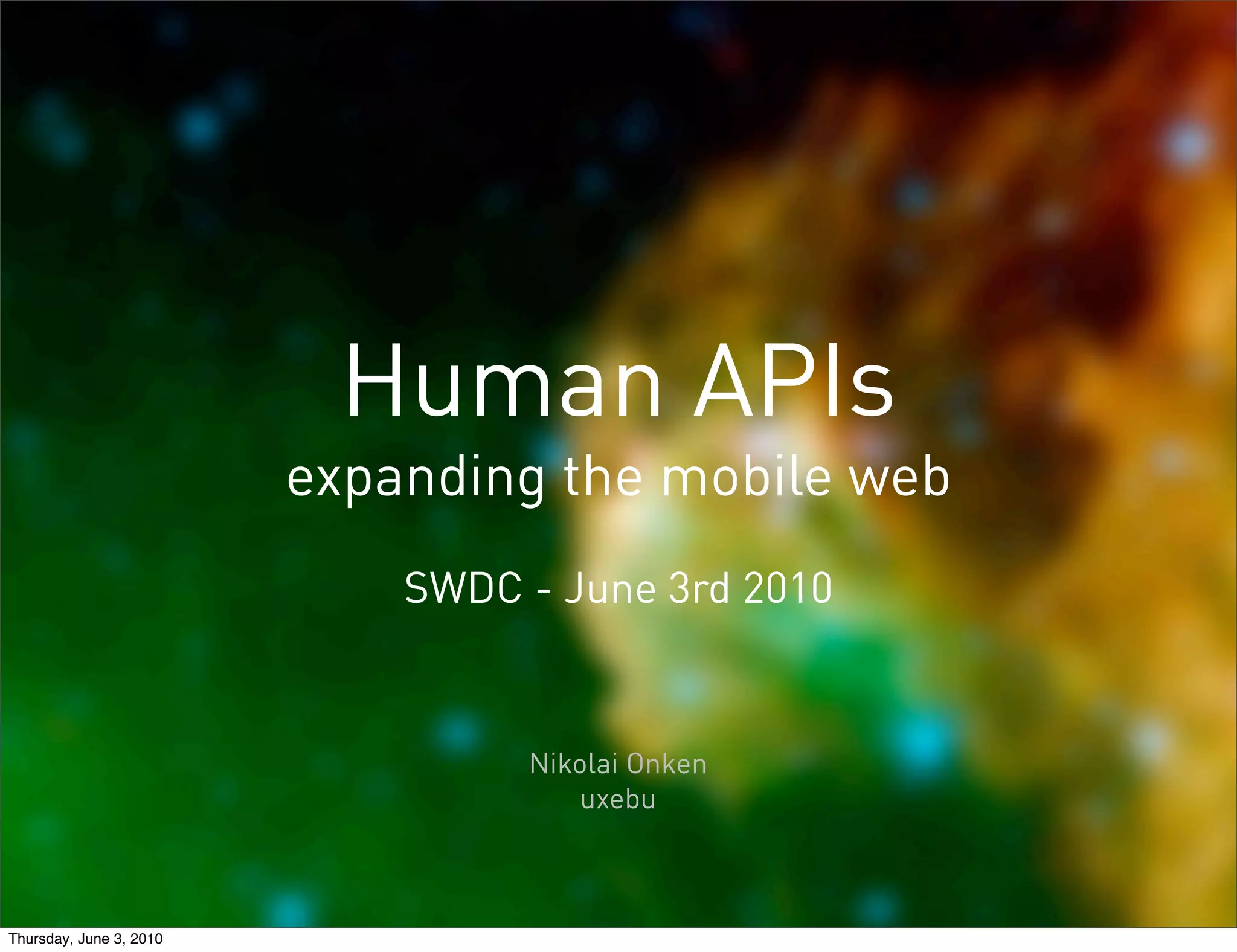 The document discusses the expanding capabilities of mobile web applications through the use of HTML5 and JavaScript APIs. It describes how PhoneGap allows accessing device capabilities like the camera from within a web browser, and how this could enable applications in areas like transportation, health, and home automation. The presentation envisions a future where the web browser acts as an interface to access the internet, cloud services, and device capabilities through a common set of APIs.