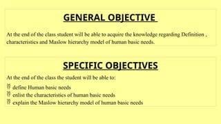 The document outlines the objectives of a nursing class focused on understanding human basic needs, including definitions and characteristics, as well as Maslow's hierarchy of needs. It emphasizes that basic needs are essential for survival, well-being, and personal growth, categorizing them into five levels with self-actualization as the pinnacle. The conclusion stresses the importance of addressing these needs to foster psychological well-being and meaningful contributions to society.