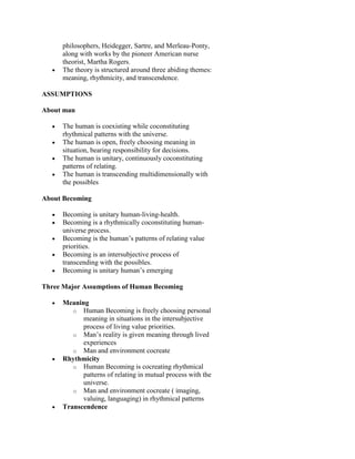 The Human Becoming Theory was developed by Rosemarie Rizzo Parse as a nursing theory to guide practice with a focus on quality of life from the patient's perspective. The theory posits that nursing aims to help patients transcend limits and emerge through rhythmic co-creation between the person and their environment. It was influenced by European philosophers and the Science of Unitary Human Beings. The theory is structured around the themes of meaning, rhythmicity, and transcendence.