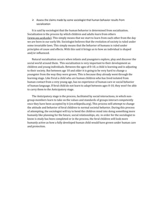 Some sociologists claim that human behavior is determined by socialization. Socialization is the process by which people, from birth, learn behaviors by observing and interacting with others. It shapes how individuals are influenced and act. For children ages 0-10 especially, natural socialization during play is important for their development as they learn and adjust to their surrounding society. It will be difficult to change a child's behaviors after age 10 if they have not gone through this early learning stage. Feral children who have no human contact or care before age 10 may not be able to learn typical social behaviors even after being introduced to human society later. The anticipatory stage aims to change feral children's attitudes and actions to be more like those with